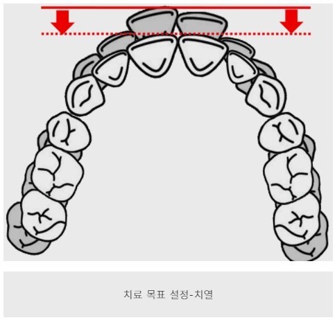 돌출 되었던 앞니를 가운데 치료 목표와 같이 노란색 화살표로 표시된 양만큼 후방으로 견인하는 목표를 세웠습니다. 최종 적으로 앞니가 목표한 지점으로 위치한 것을 볼 수 있습니다.